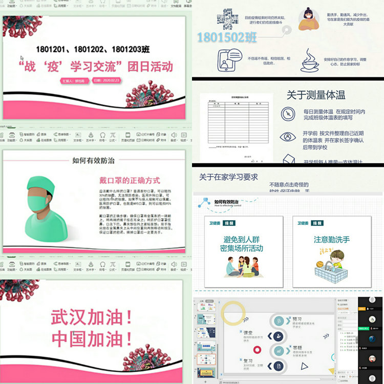 在防控疫情的特殊时期,支部成员利用线上学习、网络教学等形式开展防疫情系列活动。各位党员同志重点学习习近平总书记重要讲话精神和上级各项工作部署,进一步增强“四个意识”、坚定“四个自信”、做到“两个维护”,统一学习“战疫会议”解读、观看“武汉战疫纪”等纪录片的形式来了解学习,打好中国疫情防控阻击战。同时,党员老师们做好组织学生防控疫情的学习,通过开展线上班会、网络直播等形式组织大学生的战“疫”学习,引领学生正确认识此次疫情,做好自我及家人的防护,在保证教学进度和教学质量的同时关心关爱学生的生命安全和身体健康。